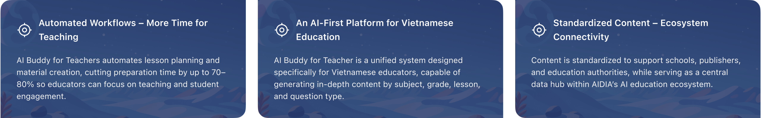 AI Buddy for Teachers is an AI-powered assistant platform built specifically for Vietnamese educators, automating core teaching tasks, reducing lesson preparation workload, and enhancing overall teaching quality.