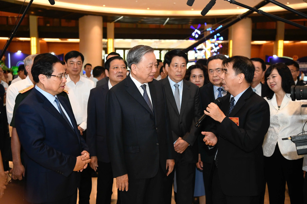 Tổng Bí thư Tô Lâm và các lãnh đạo Đảng, Nhà nước tham quan triển lãm bên hành lang hội nghị tại điểm cầu chính tại nhà Quốc hội. Ảnh Gia Hân.