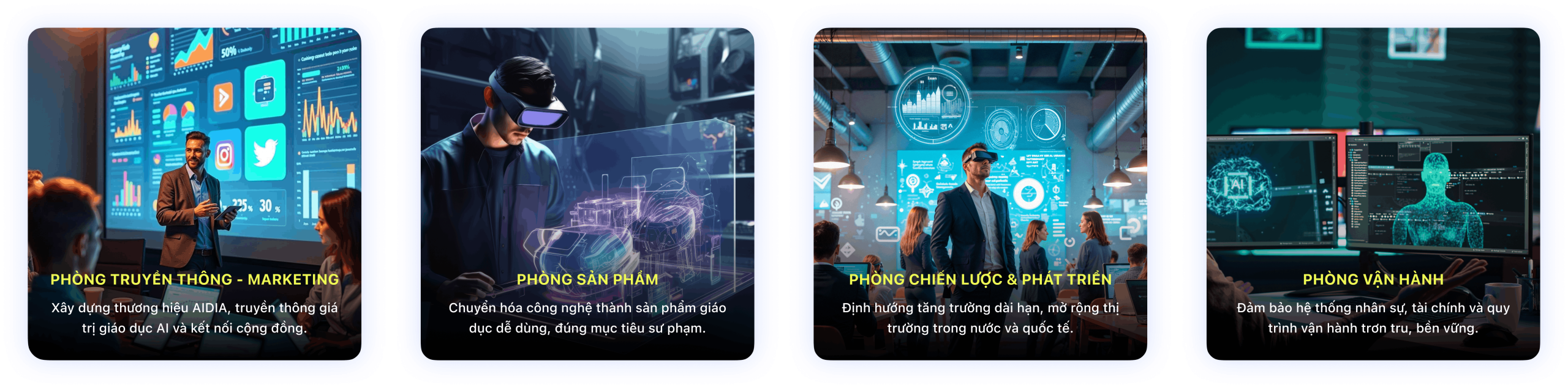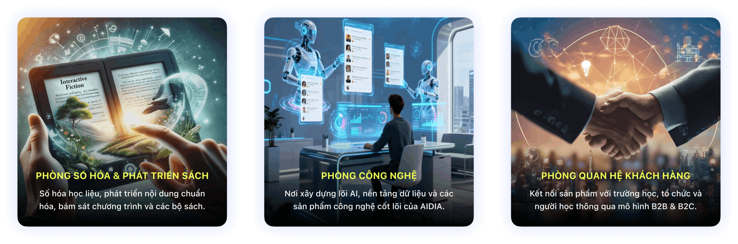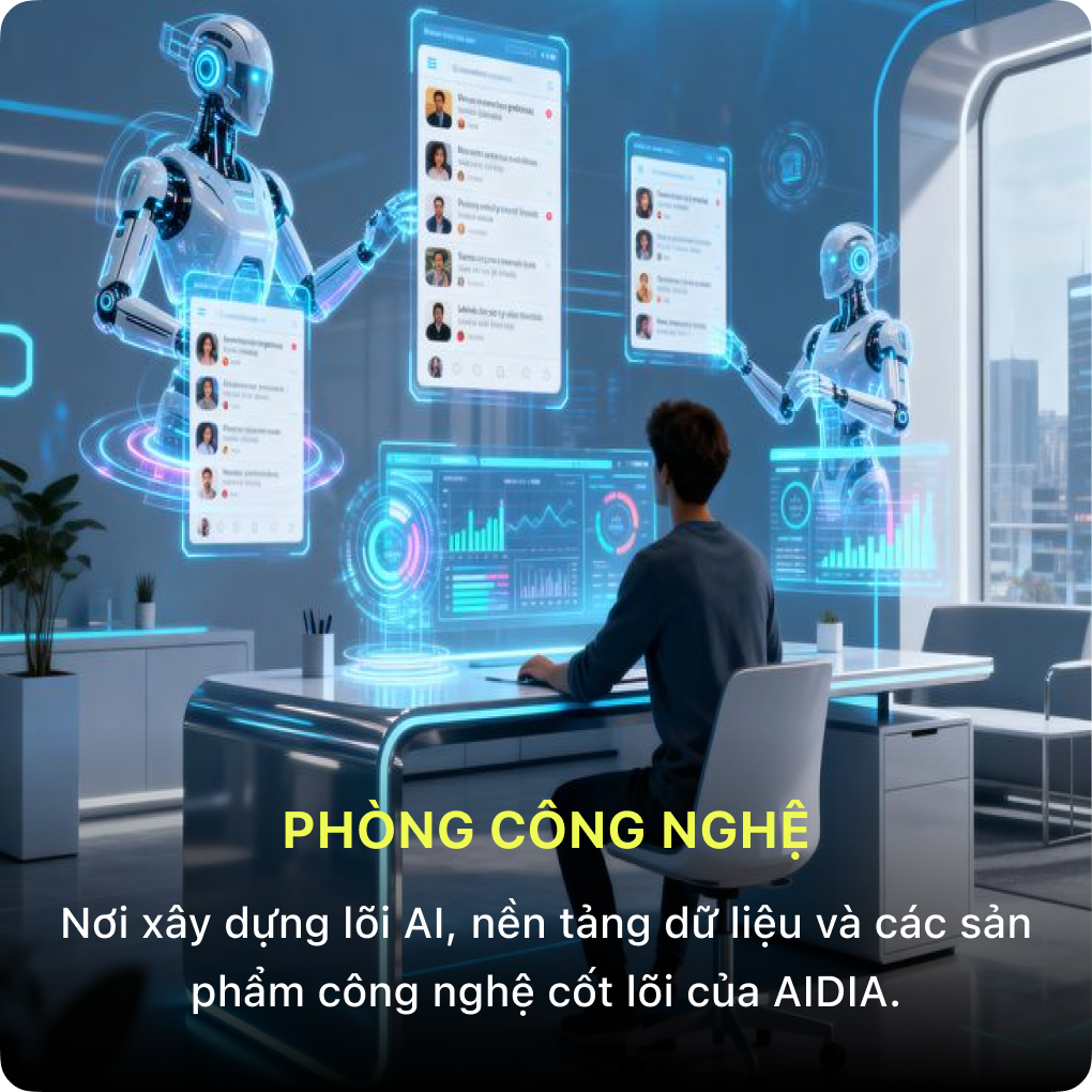 AIDIA được vận hành bởi hệ thống gần 100 nhân sự, xây dựng bài bản từ công nghệ – sản phẩm – giáo dục đến chiến lược, cùng kiến tạo hệ sinh thái AI của AIDIA.